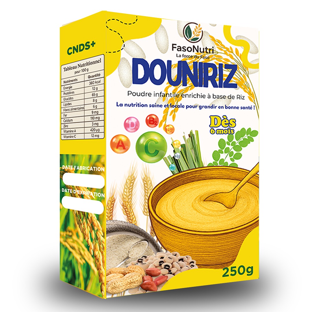 DouniRiz est une poudre infantile enrichie à base de riz local, formulée pour soutenir la croissance et l’énergie des enfants. Sa texture légère et sa haute digestibilité en font un repas idéal dès le jeune âge.